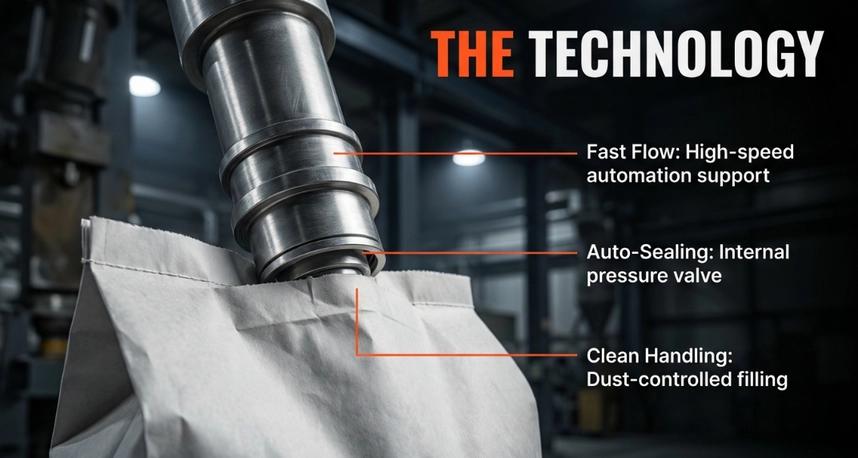 А мешок с клапаном Это предварительно сформированный мешок с заправочным клапаном, который герметизируется под давлением продукта. Он широко используется для цемента, строительного раствора, порошков и гранулированных материалов.